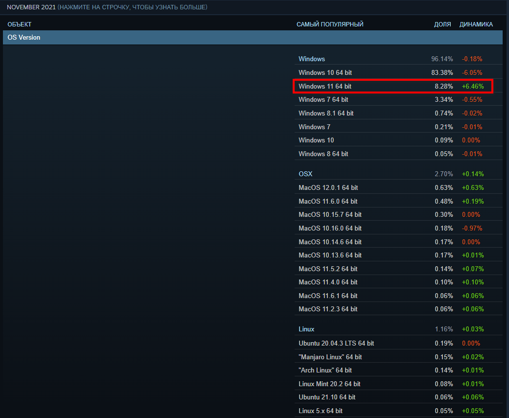 Стоит добавить, что похожий показатель, а именно – 8,28% потребителей используют Windows 11, отображен в последнем отчете Steam за ноябрь.