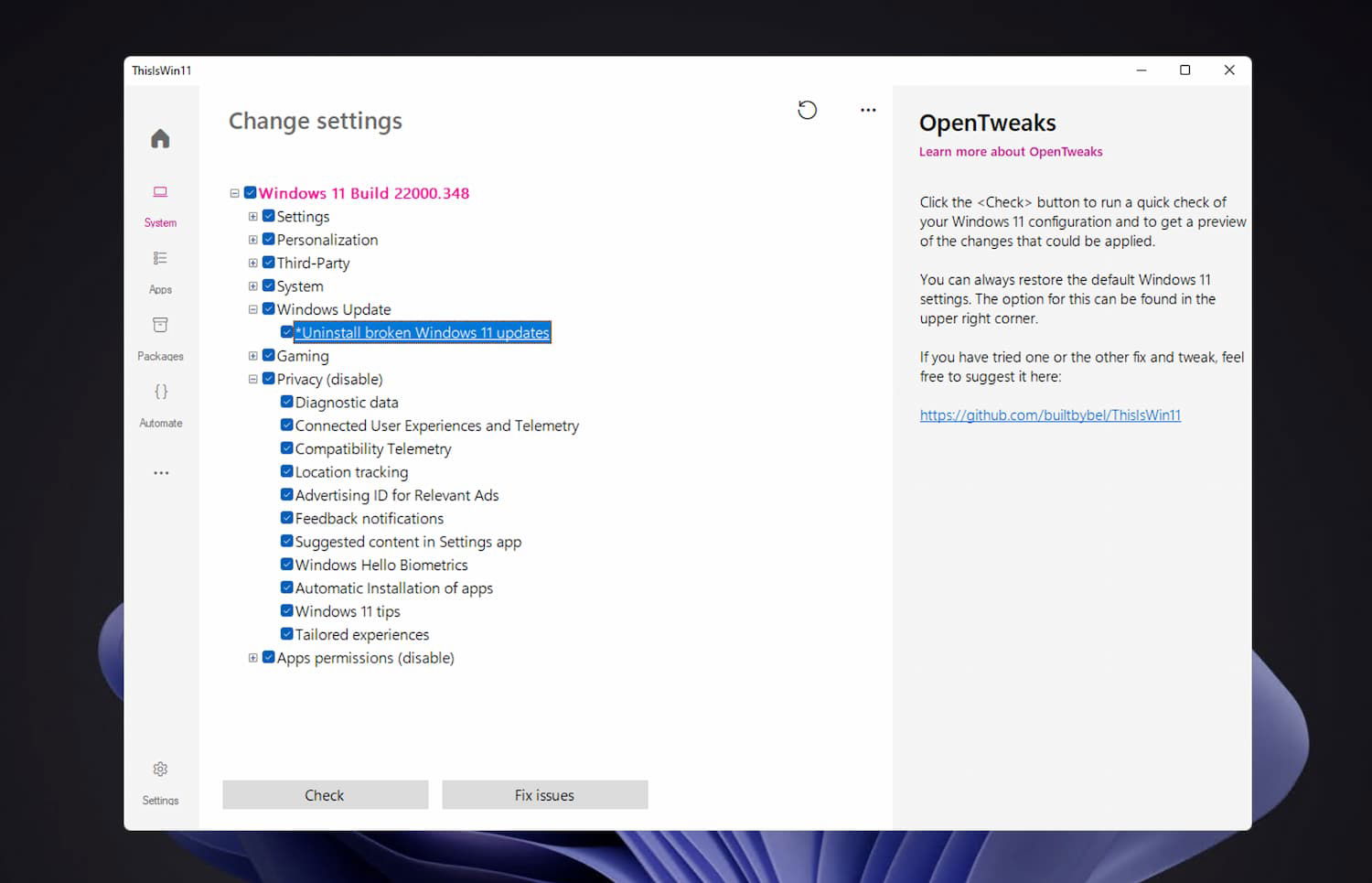 Согласно примечаниям к выпуску ThisIsWin11, новая версия включает преимущественно исправления «проблем интерфейса». Наиболее интересное изменение — добавление секции «Windows Update» с возможность удаления поврежденных обновлений в модуле OpenTweaks.