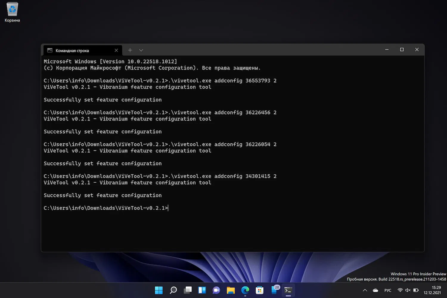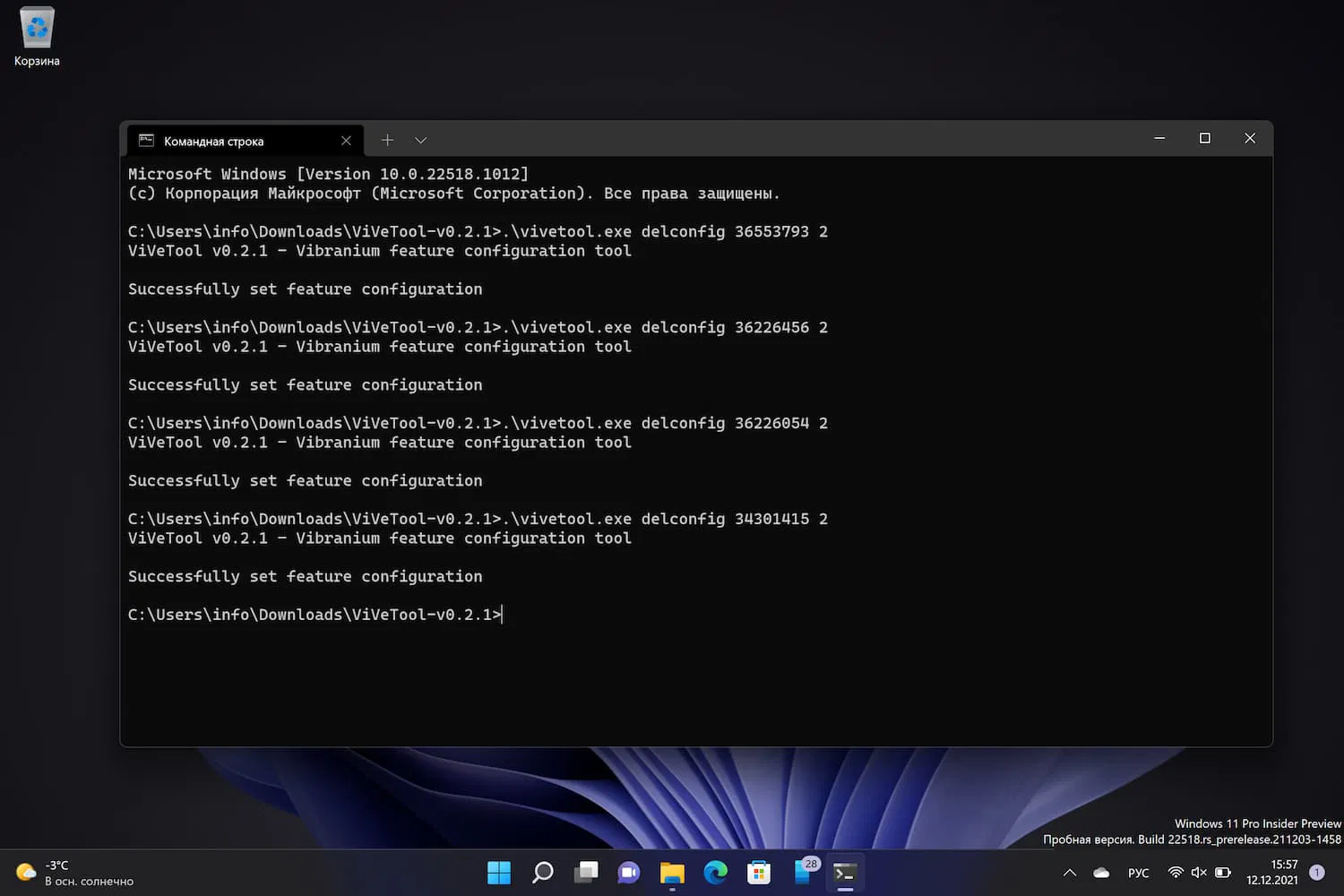 • Если вы хотите отключить новую функцию отображения виджетов с погодой на панели задач в Windows 11, снова запустите Терминал Windows в папке ViveTool и выполните следующие команды: