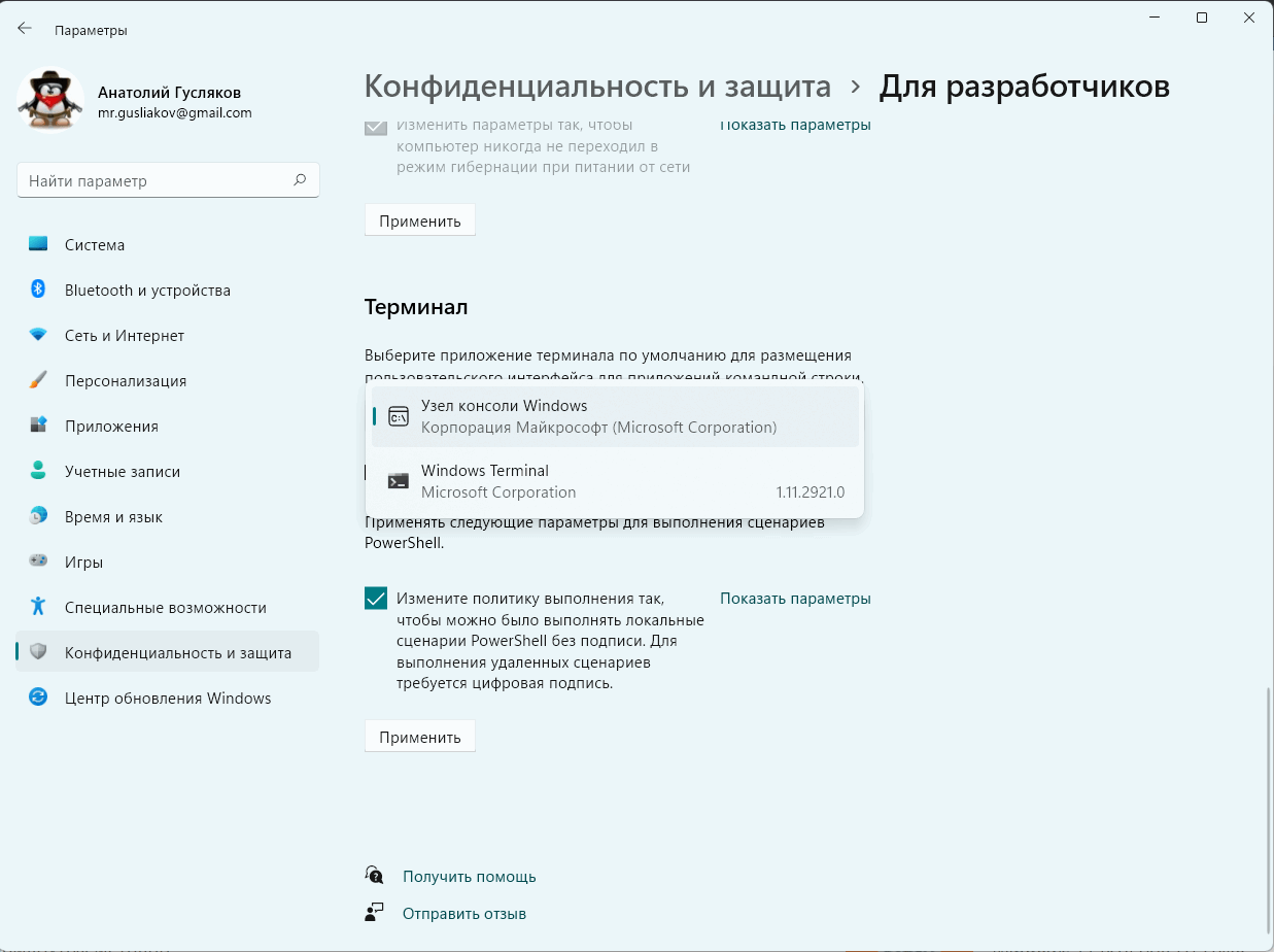 Как отмечает Microsoft, вскоре пользователи смогут устанавливать различные терминалы по умолчанию, включая Терминал Windows. Эта опция уже доступна в Windows 11 для Терминала Windows, и есть несколько способов включить ее, в том числе страница параметров Конфиденциальность и защита > Для разработчиков Windows, настройки Терминала Windows на странице запуска или страница свойств для Узла консоли Windows (Windows Console Host).