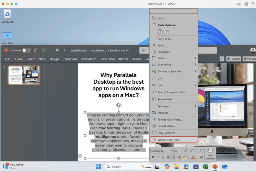 • Добавление инструментов Apple с поддержкой ИИ в контекстное меню Windows в Word, PowerPoint и классической версии Outlook. Ранее для доступа к ним требовалось использовать сочетание клавиш или меню «Правка» в строке меню macOS.