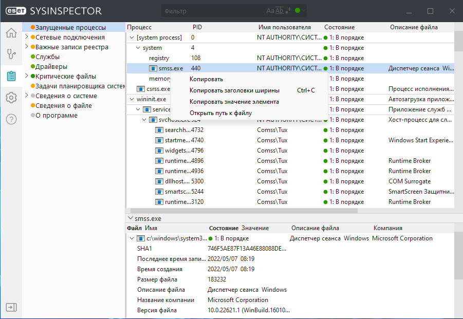 Скриншоты ESET SysInspector